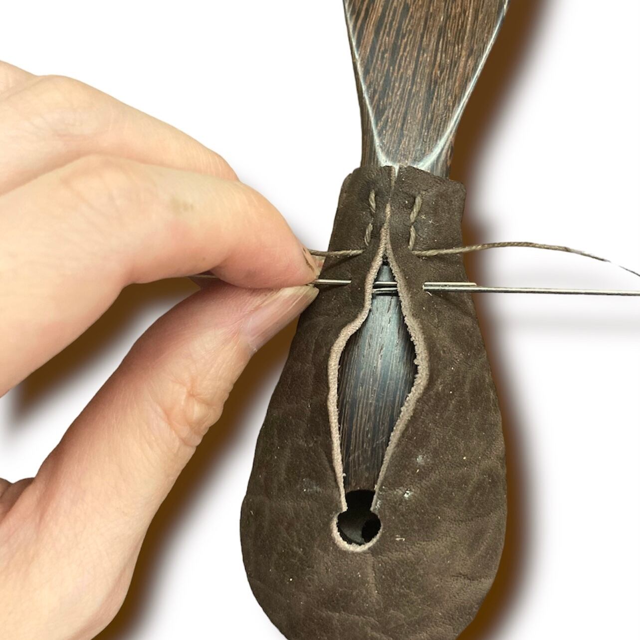 持ち手の裏部分には、握った時に変な引っかかりがない様、フラットな状態に、表は、スキンステッチと呼ばれる革を貫通させずに縫うハンドステッチで縫い合わせ、仕上げました。