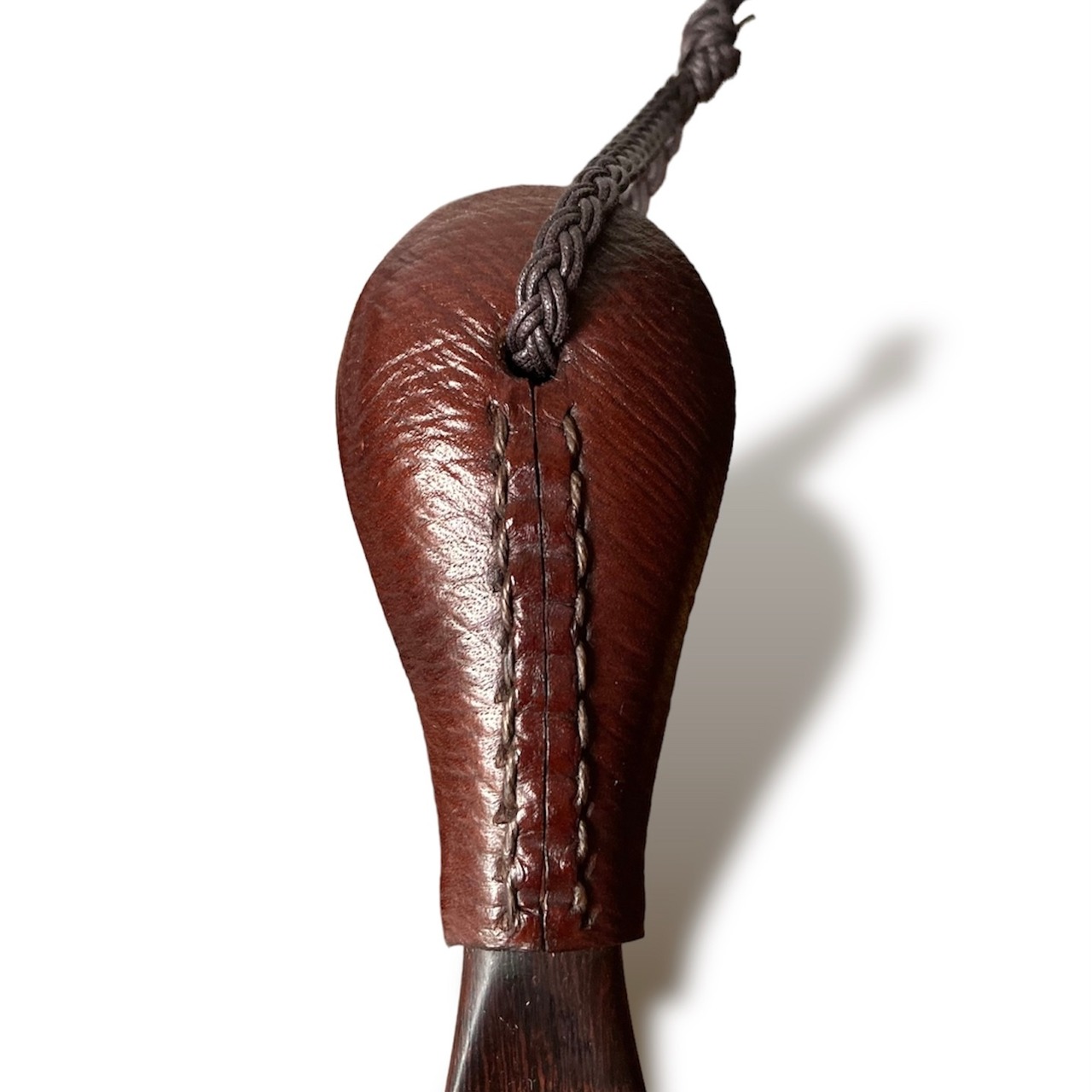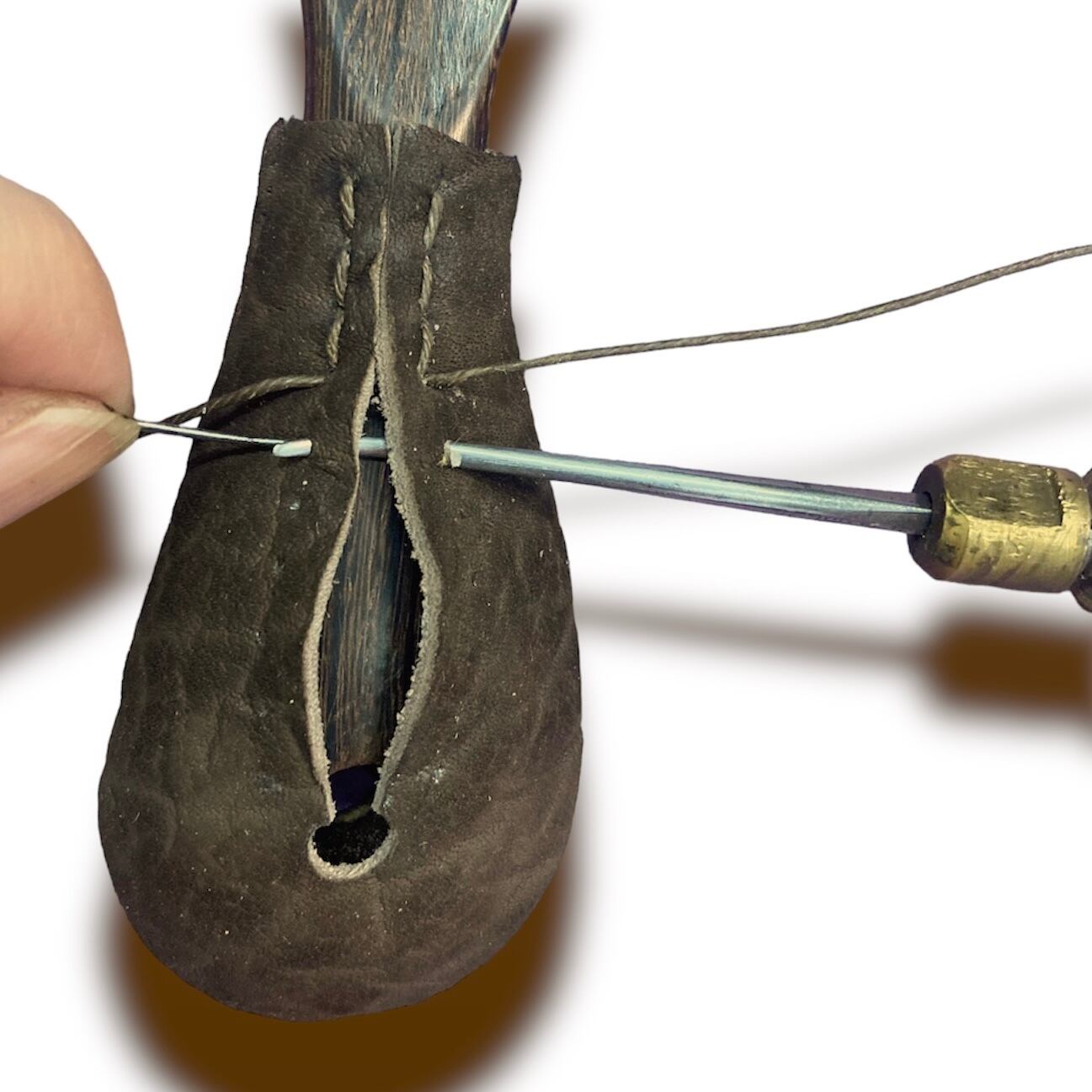 持ち手の裏部分には、握った時に変な引っかかりがない様、フラットな状態に、表は、スキンステッチと呼ばれる革を貫通させずに縫うハンドステッチで縫い合わせ、仕上げました。