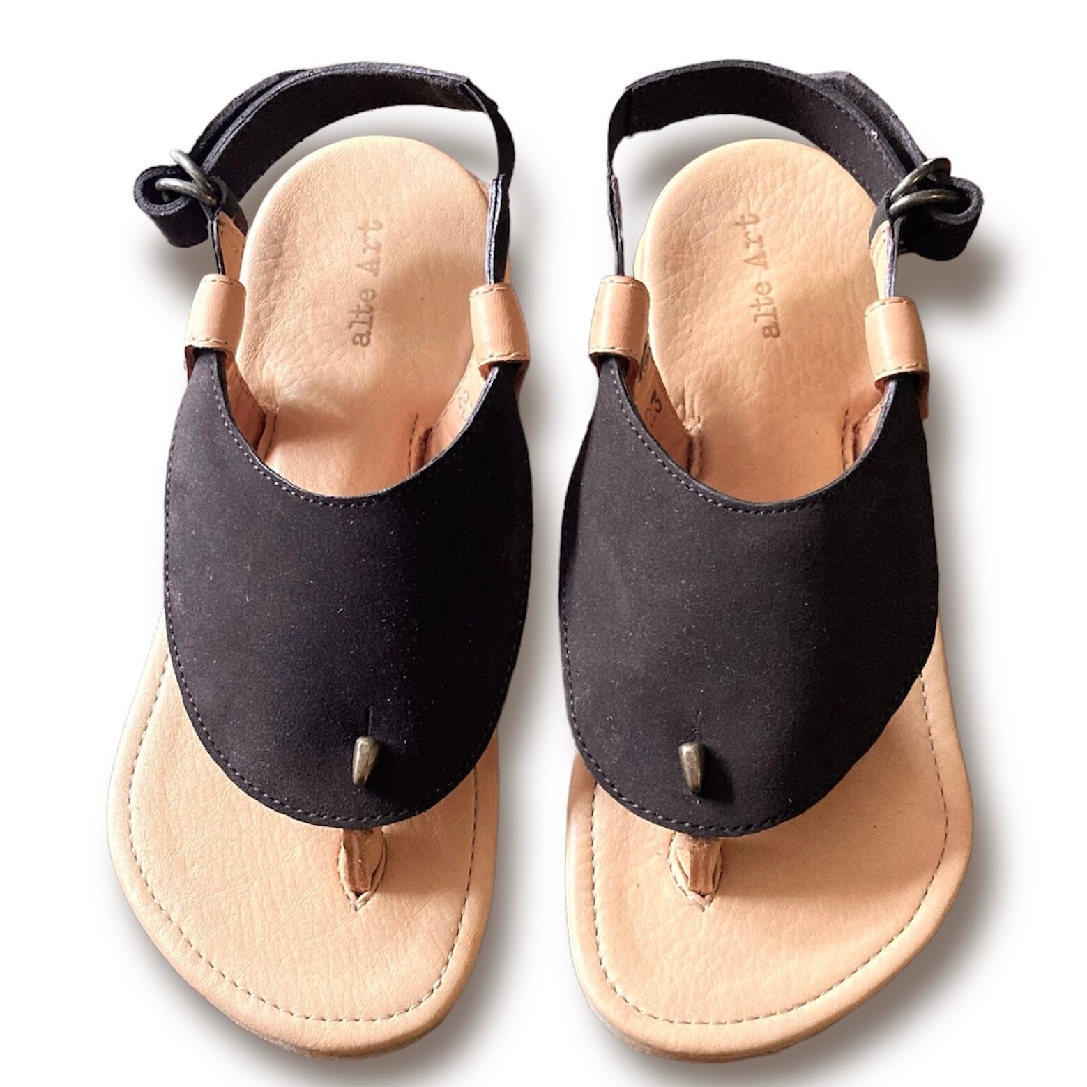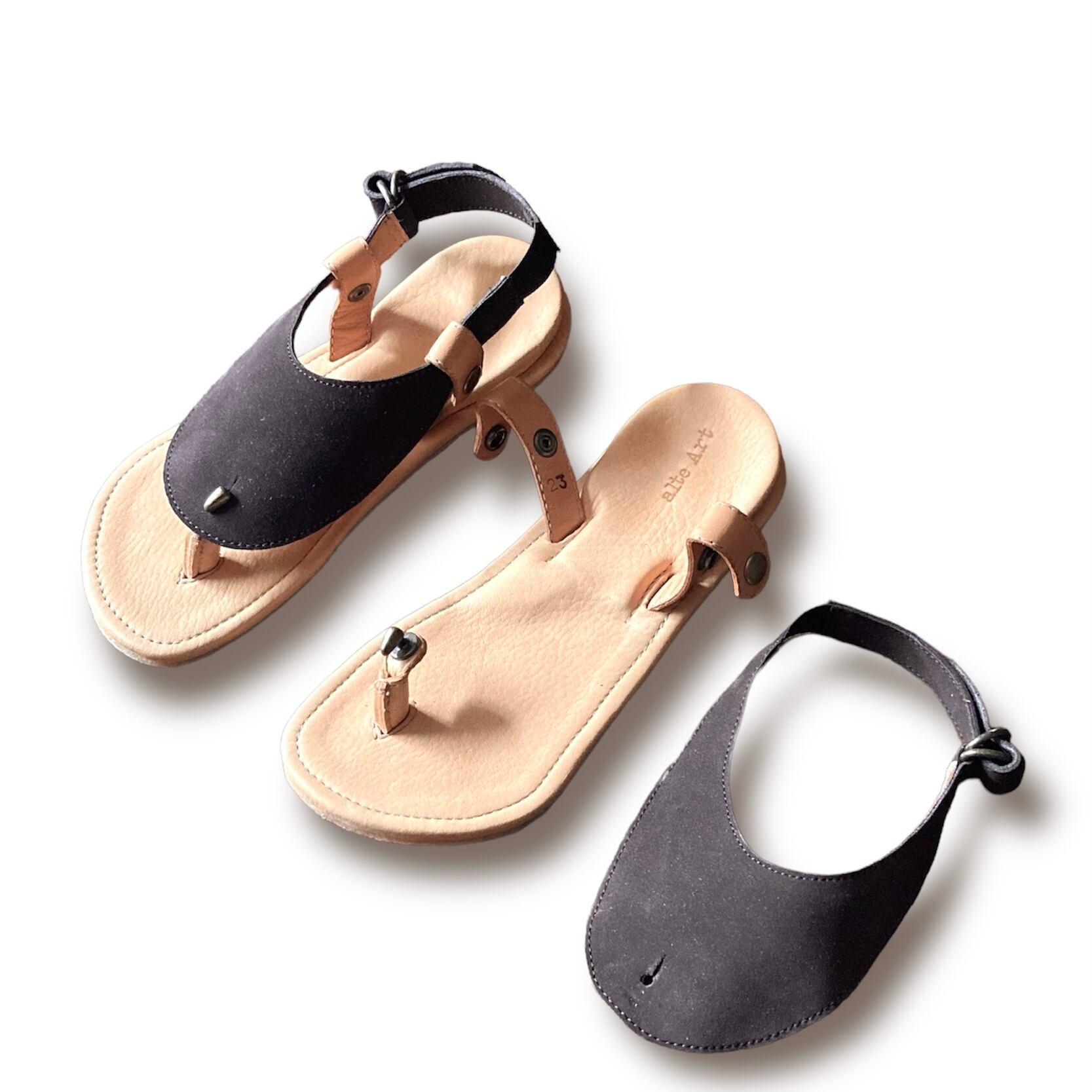 サイドのベルトがボタン、甲部の鼻緒がくちばしギボシになっていて、アッパーが取り外せます。