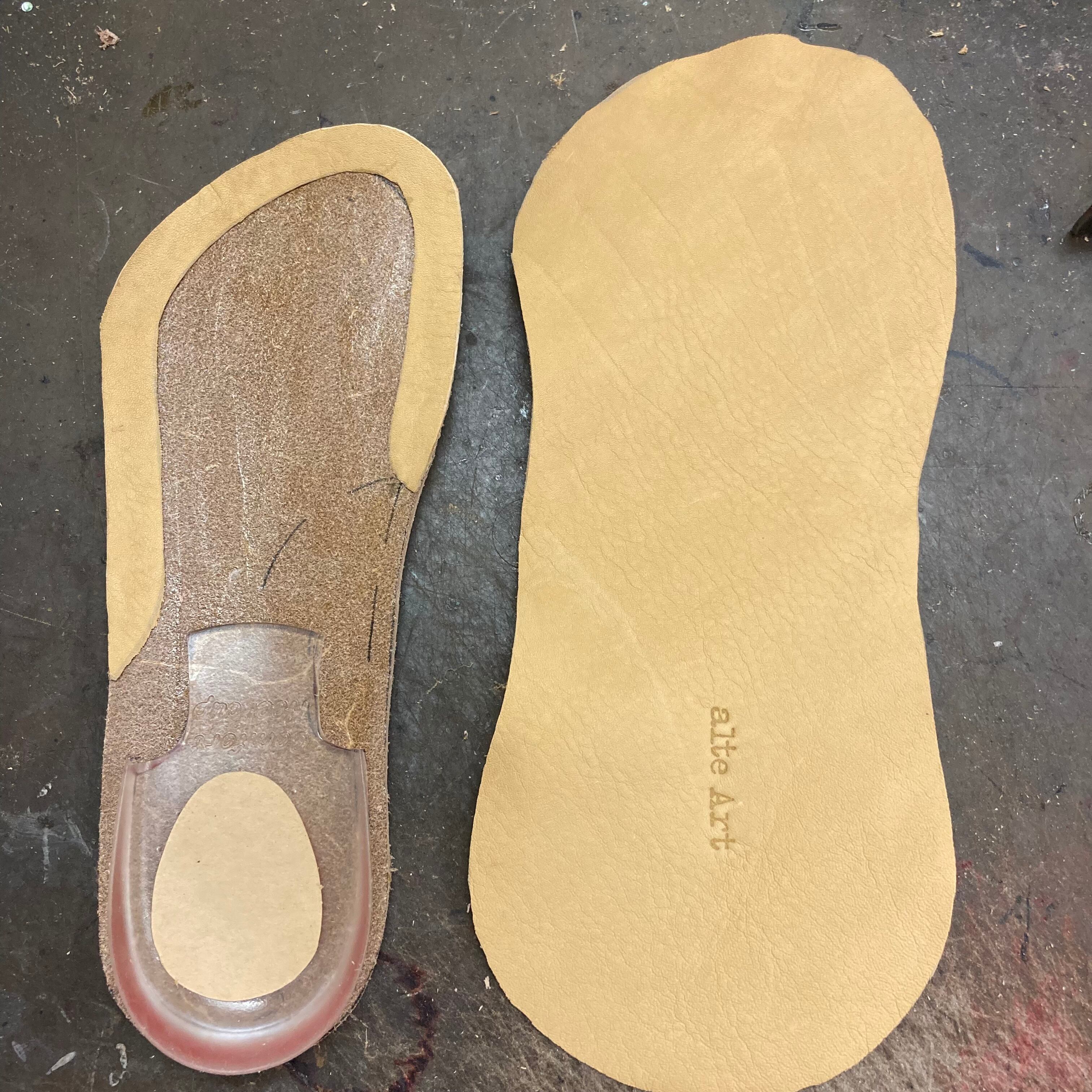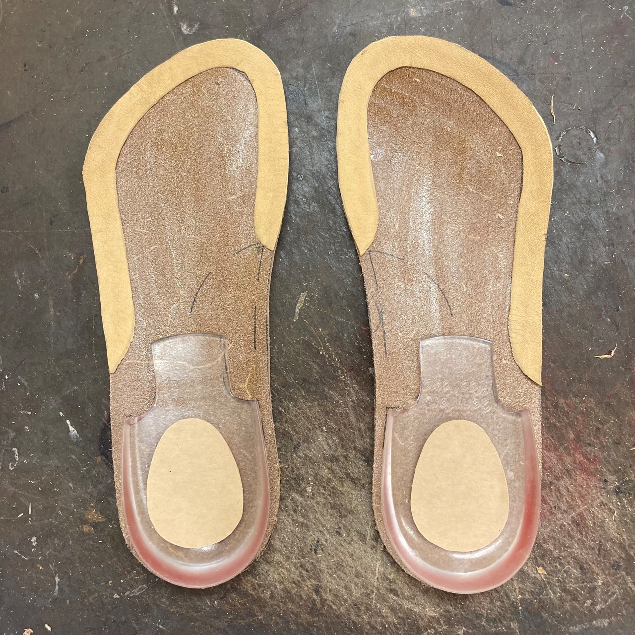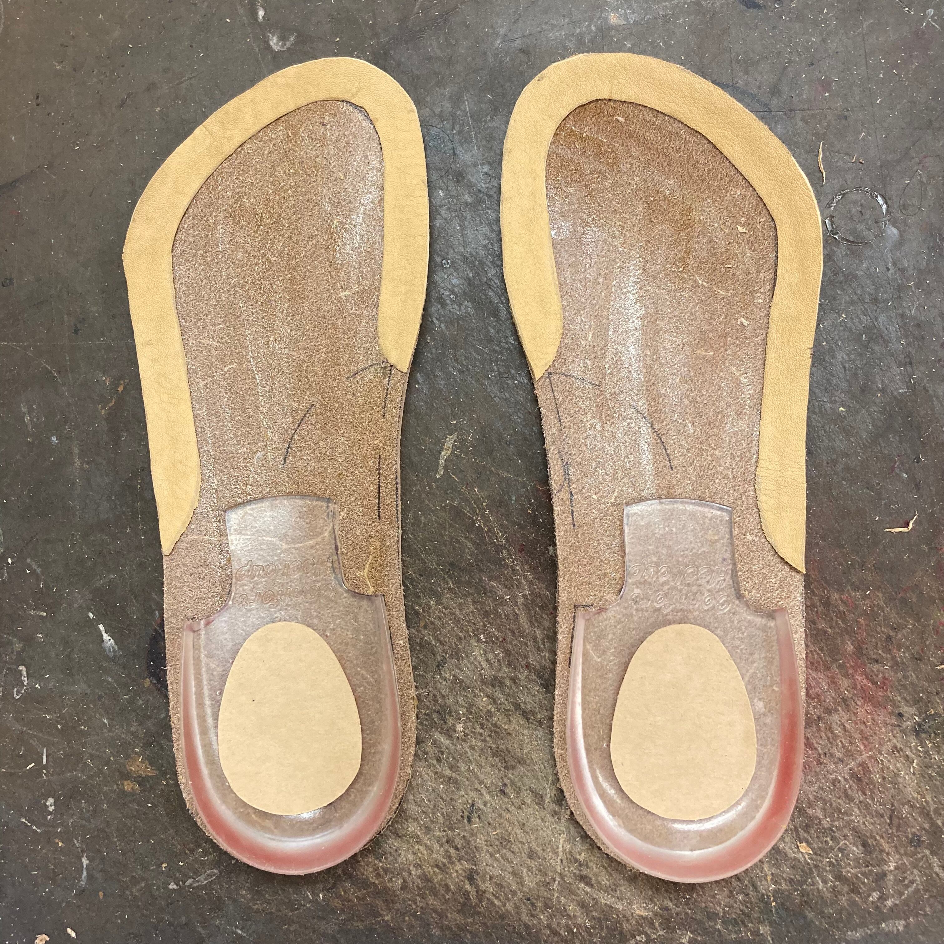 インソールは3ミリ厚のヌメ革を全体に使用し、シリコンクッションのヒールカップごと、整形靴用に生産されたカーフ(当店別注色)で包み、さらに2ミリ厚のコルクを中に入れてあります。